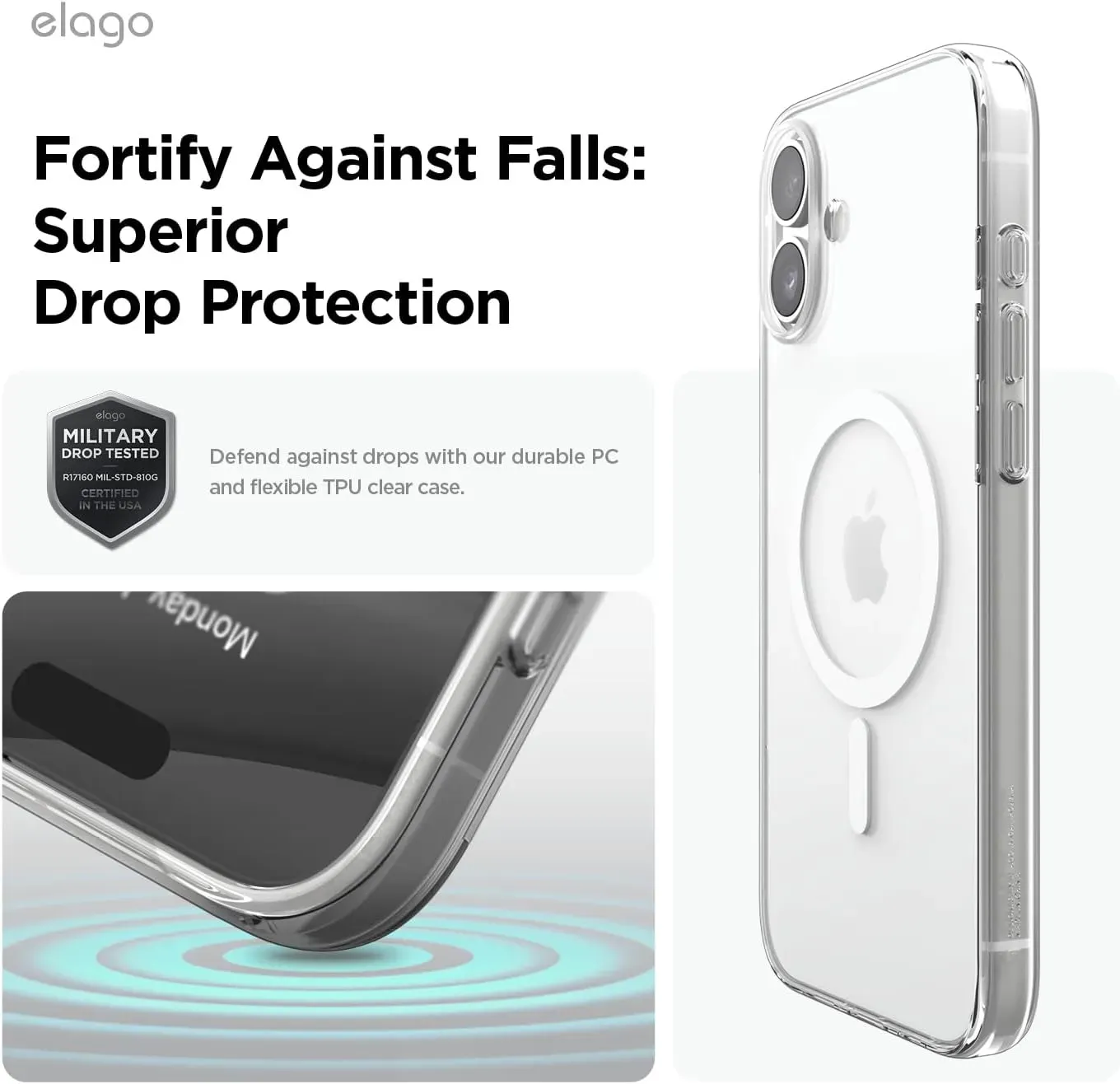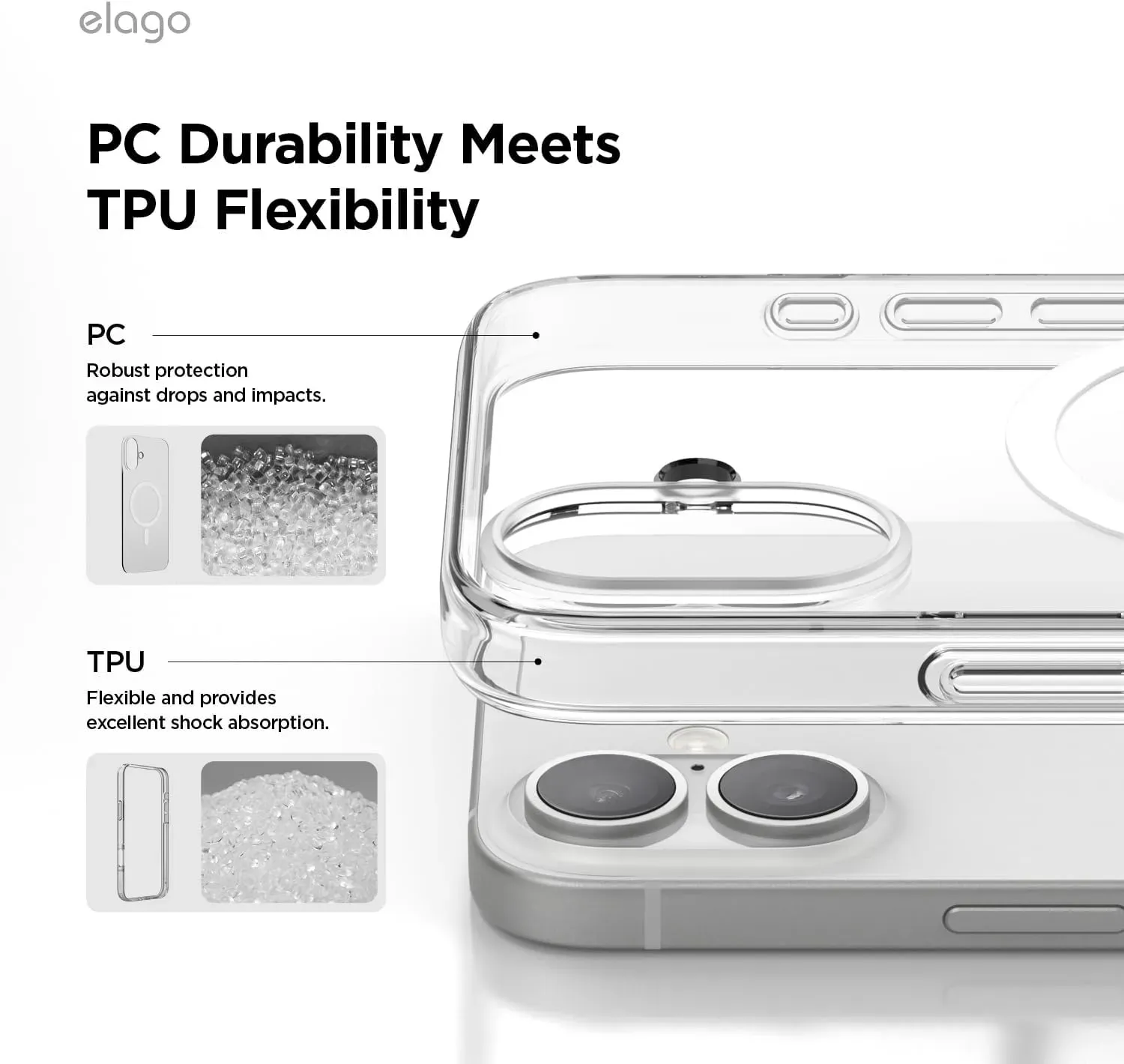 Estuche para iPhone 16 Magsafe Elago en Transparente: Al utilizar dos materiales para crear este estuche, el estuche híbrido mezcla policarbonato y tpu en una combinación perfecta que ofrece una increíble protección diaria contra caídas, suciedad, polvo y rayones.